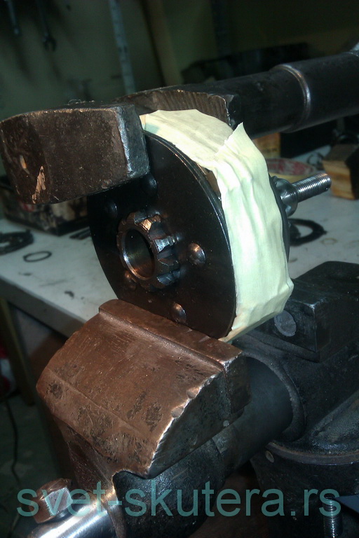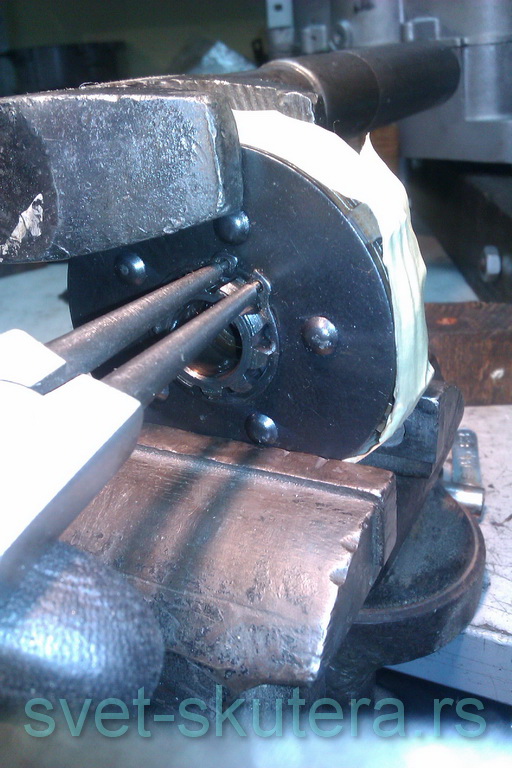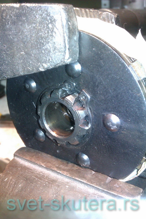 i ovde vidimo da je mali imao drugačiju osovinu, tj stari tip je sa običnom maticom bez osigurača i levi navoj.. .interesantno je bilo da nije bilo malog aksijalnog ležaja koga bi inače trebala da stegne matica već samo platne..