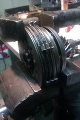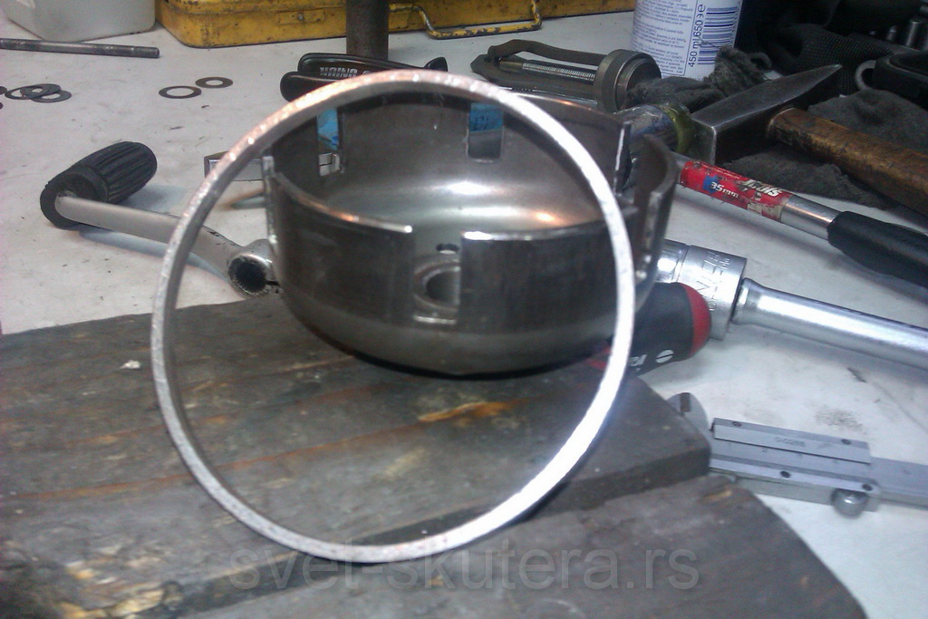 dalje, pošto je kod deve definitivno problem slabašnog zvona i kvačila rešio sam par čeličnih prstenova od cevi koja je u sličnim dimenzijama kao i zvono 75/79 mm pa smo samo doterali na strugu da nailazi tesno.. ovaj patent sam prvi put video kod Mladen-a u temi, i na još jednom mestu na tomos forumu i deluje mi kao ok ideja..usput povarili su mi i ovu pukotinu od devinog zvona...