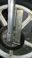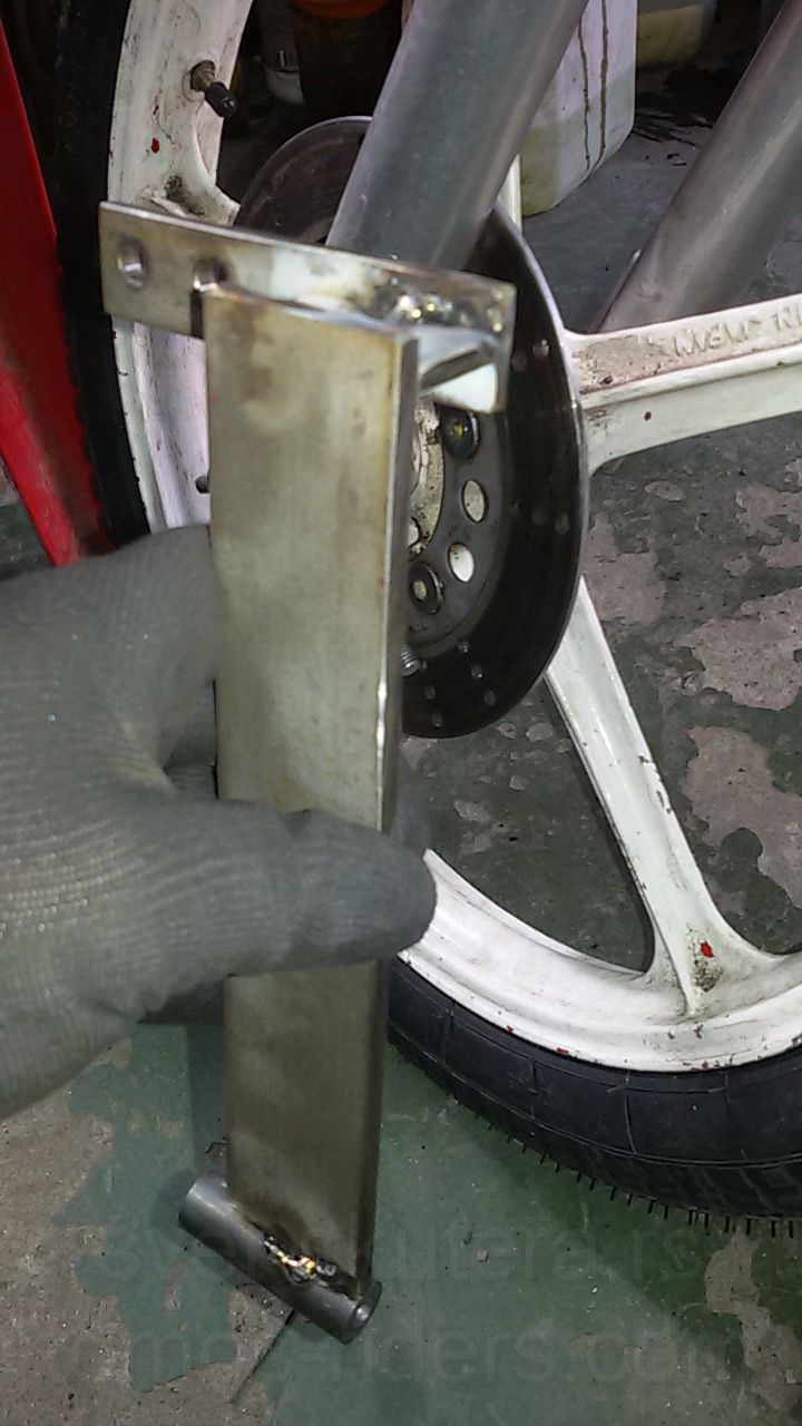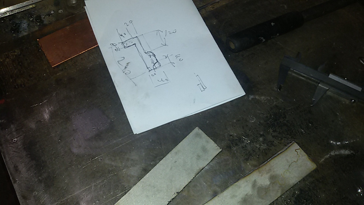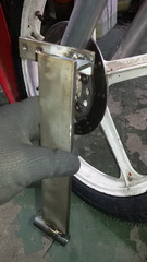 i odlučio sam poslužiti se sa 5mm debelim prohrom čeličnim limom, koji će biti nosač učvršćen u dve tačke, dole na šrafu M8 koji steže levu čizmu oko osovine i gore na dva mala M7 brezona koji su na čizmi nosač blatobrana
