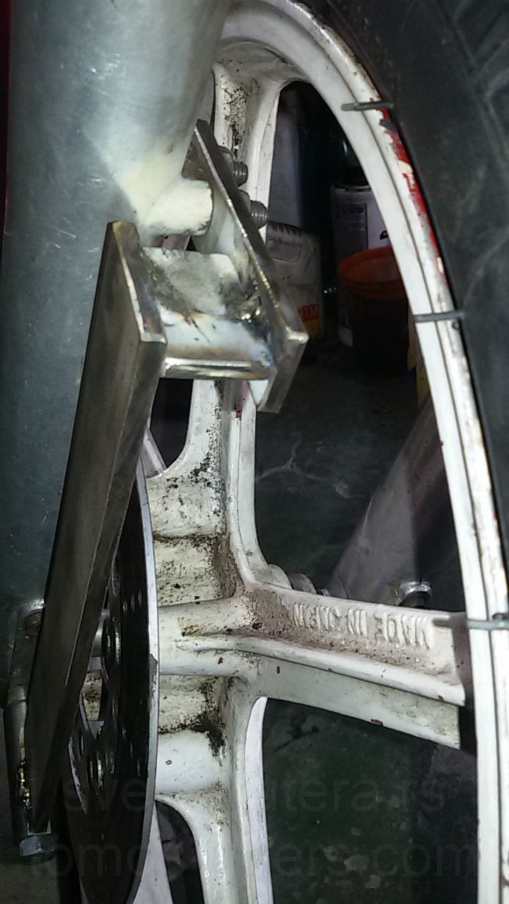 sad preostaje još da izvadim malo materijala kako bi prednji kočioni cilindar ušao malo dublje i montirao ga više prema centru... Namerno sam odmaknuo ceo nosač za 10mm od čizme, kako bih imao mogućnost za montažu i eventualno spremio se za aplikaciju većeg diska.. Ovde je 210mm originalni još uvek, sa 82mm rupom i 5 šrafova...