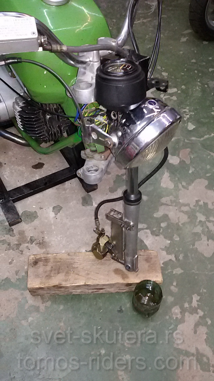 na kraju dana sam montirao ručice, kupio sam komplet od Kymco Agility-ja..  tražio sam baš komplet levu i desnu da mi budu jednake, a eto Kymco pravi desnu ručicu veću, levu manju... nema veze, rešiću to kasnije. za sajlu kvačila je isto bilo gimnastike trebalo je uraditi odstojnik i prelaz za 6mm bužira na 8mm, kako je kod skutera, pa je tu išla prerada nekog imbus M8 šrafa... itd...  za prednju ovde imam neko gumeno armirano crevo što mi je ostalo od skutera, do kraja dana nisam uspeo da odzračim kočioni sistem...   dakle ni kod mene još ništa pozitivno.
