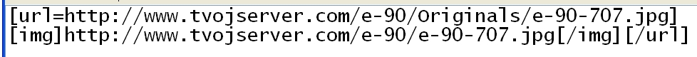 evo ovde imaš kako to izgleda, prvo ide tag URL koji poziva adresu hiperlinka kada neko klikne na sliku, a taj link je slika na www.tvojserver... recimo e-90 / Originals znači da je velika 1280x720, i naravno njen broj , kod mene je recimo ime e-90-707 idu brojevi redom... , posle toga dolazi bez razmaka u produžetku tag slike IMG i njena adresa, ovo je ista ta slika broj 707 samo mala 320x240 koja se prikazuje i na koju čitaoc može da klikne... i na kraju ide zatvaranje tagova / IMG i / URL u uglasim zagradama